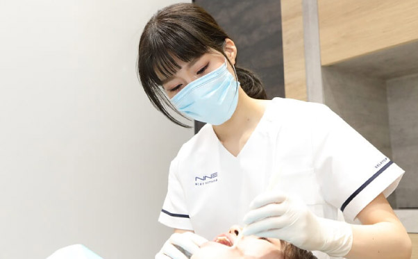 パウダーを強力噴射して歯石・プラークを除去する「EMSエアフロー」による予防です。痛みはゼロに近く、リラックスした状態で受けていただけます。歯を傷つけることもありません。